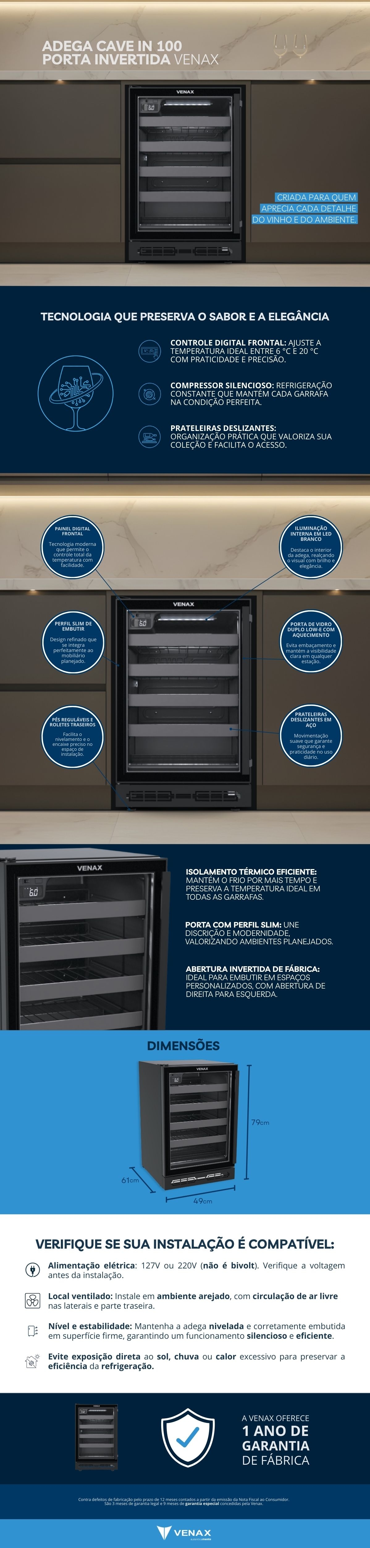 Adega Cave In 100 de Embutir Porta Invertida*. Conta com Capacidade para até 24 Garrafas com Diâmetro de até 9cm. Porta de Vidro Duplo Low-E com Perfil Slim, Aquecimento da Porta, Puxador em Alumínio Pintado Em Preto, Controle de Temperatura Digital Regulável de 6ºC até 20ºC, Iluminação Interna em LED na Cor Branca, Prateleiras Deslizantes, com Sistema de Refrigeração por Compressor.