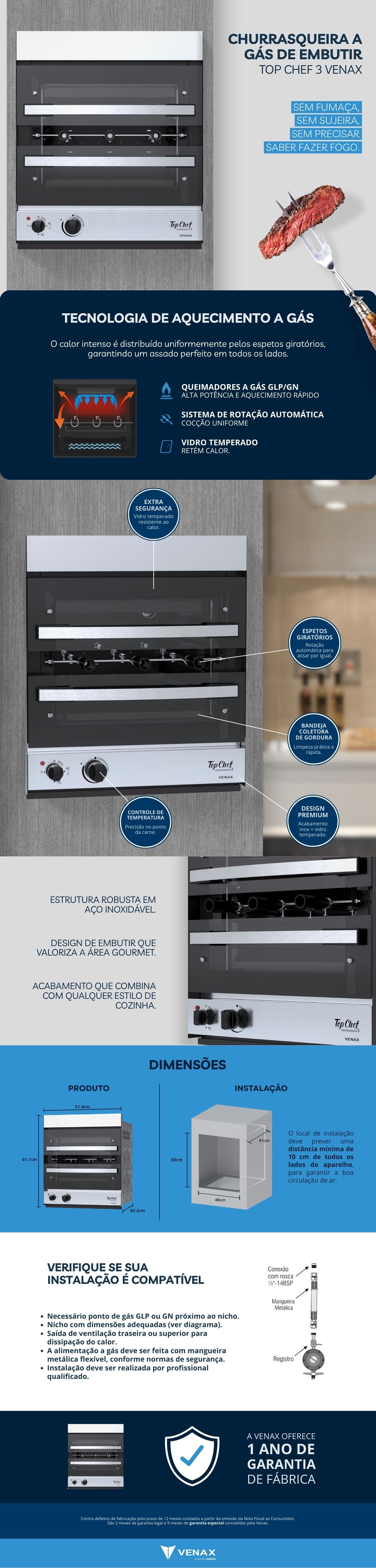 A Churrasqueira a Gás de Embutir Top Chef Possui 3 Espetos Giratórios com Capacidade de 2 Kg de Carne Cada, Queimador Infravermelho, Acendimento Superautomático, Luz Interna, Bandeja Coletora de Resíduos Esmaltada Easy Clean, Porta de Vidro Bi Partida Com puxadores em Aluminio, Corpo Interno Esmaltado Easy Clean e Acabamento Externo em Aço Inox Escovado.