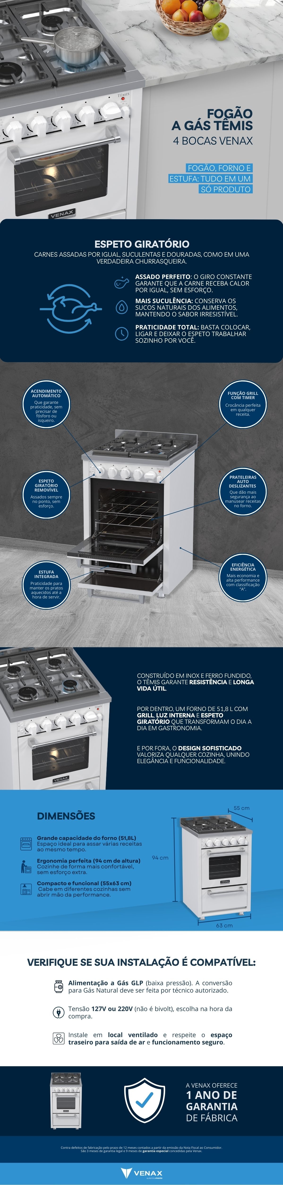Fogão de Piso 4 Bocas Têmis, com Acendimento Automático Total, Com Estufa, Visor na Porta do Forno, Trempes Duplas de Ferro Fundidos, Mesa de Inox, Luz no Forno, Puxador na Porta do Forno e Estufa em Aço Cromado, Portas Removíveis, Grill Dourador no Forno com Timer, Duas Grades Deslizantes no Forno, Bandeja Coletora de Gordura no Forno, Um Espeto Giratório, Forno Easy Clean.
