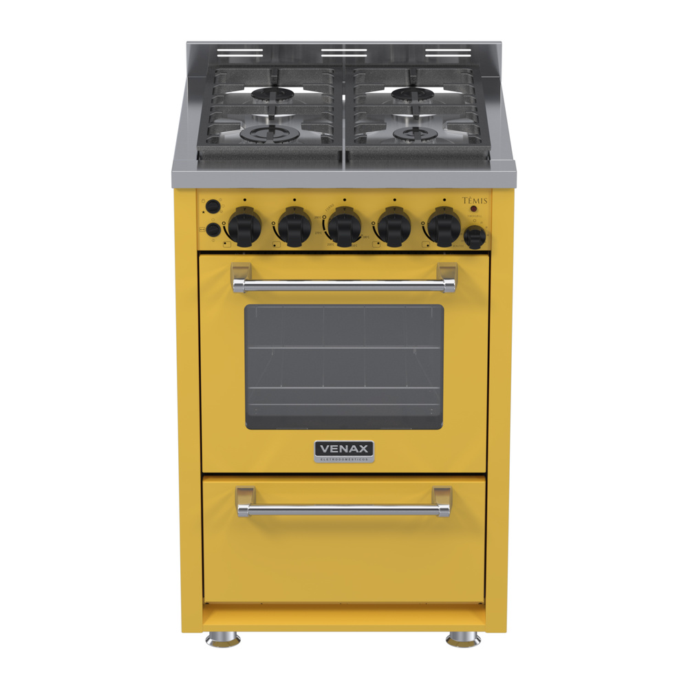 Fogão de Piso 4 Bocas Têmis, com Acendimento Automático Total, Com Estufa, Visor na Porta do Forno, Trempes Duplas de Ferro Fundidos, Mesa de Inox, Luz no Forno, Puxador na Porta do Forno e Estufa em Aço Cromado, Portas Removíveis, Grill Dourador no Forno com Timer, Duas Grades Deslizantes no Forno, Bandeja Coletora de Gordura no Forno, Um Espeto Giratório, Forno Easy Clean.