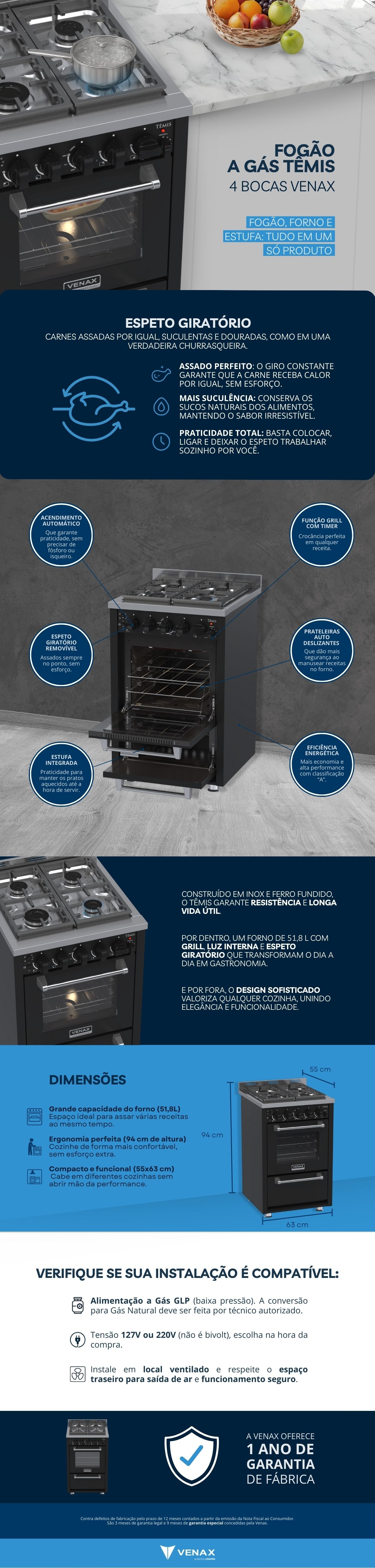 Fogao 4 Bocas Venax Temis Preto GLP