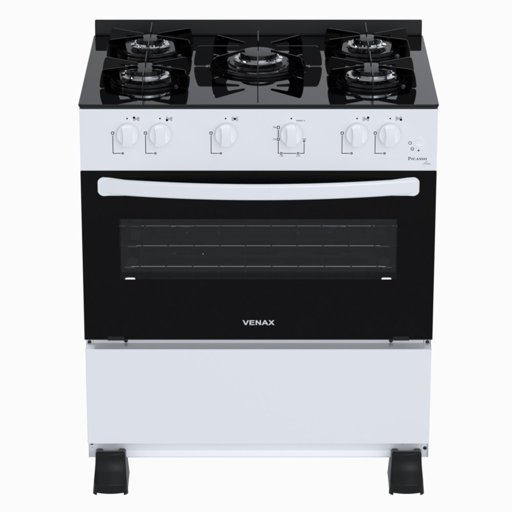 Fogão de Piso 5 Bocas Picasso Line, com Acendimento Automático Total, Vidro na Porta do Forno, Trempes Individuais Esmaltadas, Mesa de Vidro, Botões Frontais, Puxador na Porta do Forno em Aço, Porta Removível, Uma Grade Deslizante no Forno, Forno Easy Clean.