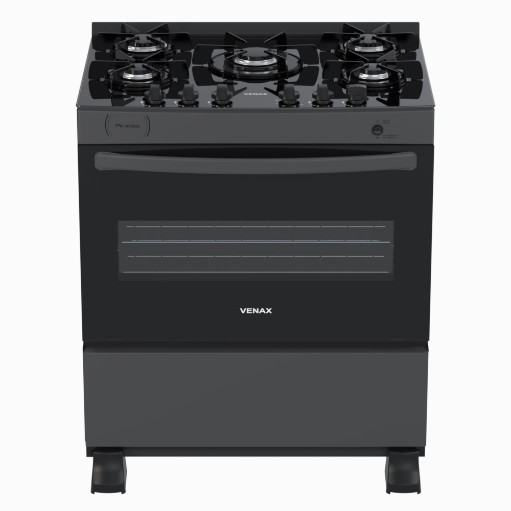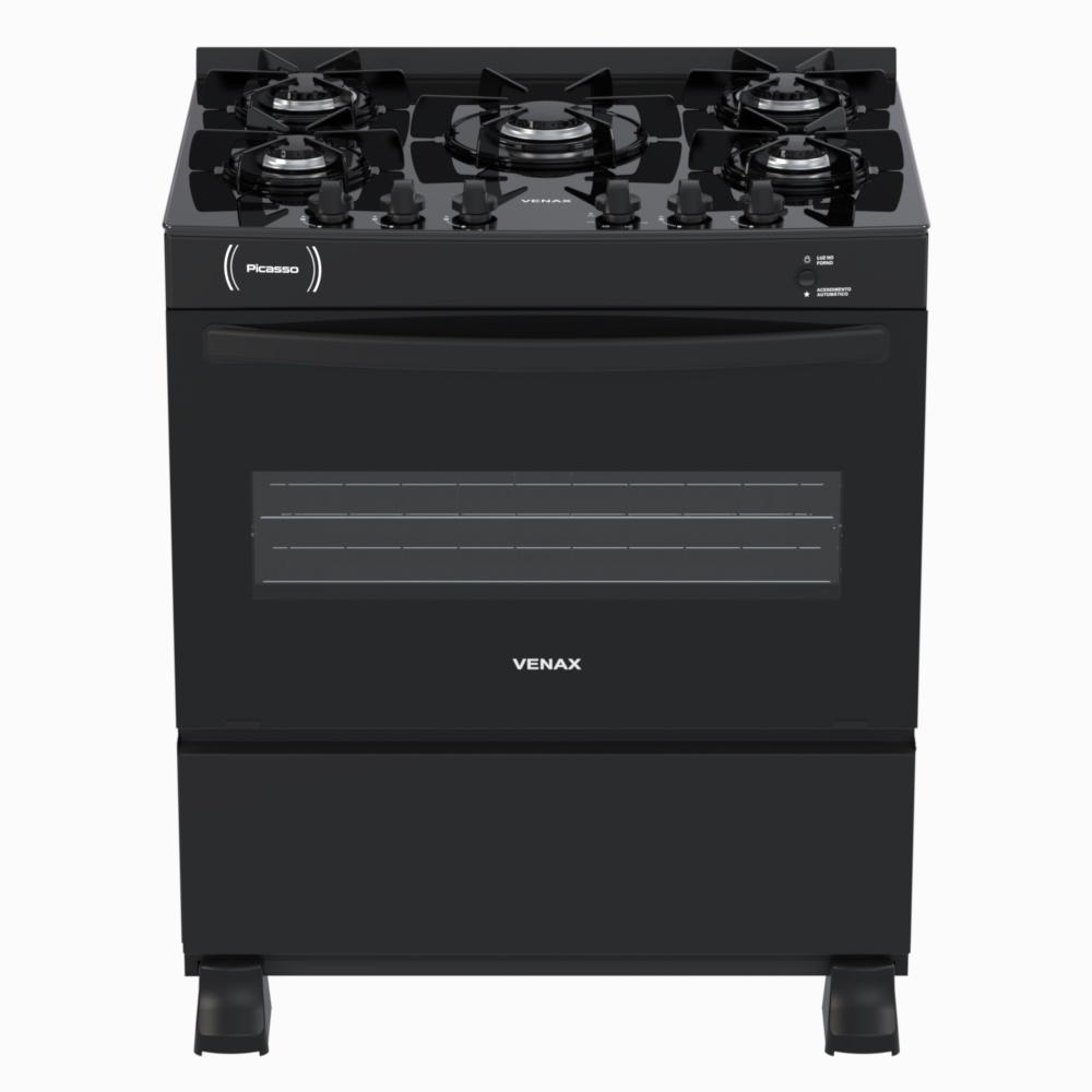 Fogão a Gás 5 Bocas Picasso Vítreo, Mesa de Vidro, com Acendimento Total, Botões Removíveis, Trempes Individuais Esmaltadas, Vidro na Porta do Forno, Luz no Forno, Puxador da Porta do Forno em Aço Pintado, Porta Removível, Duas Grades Deslizantes no Forno e Forno Easy Clean.