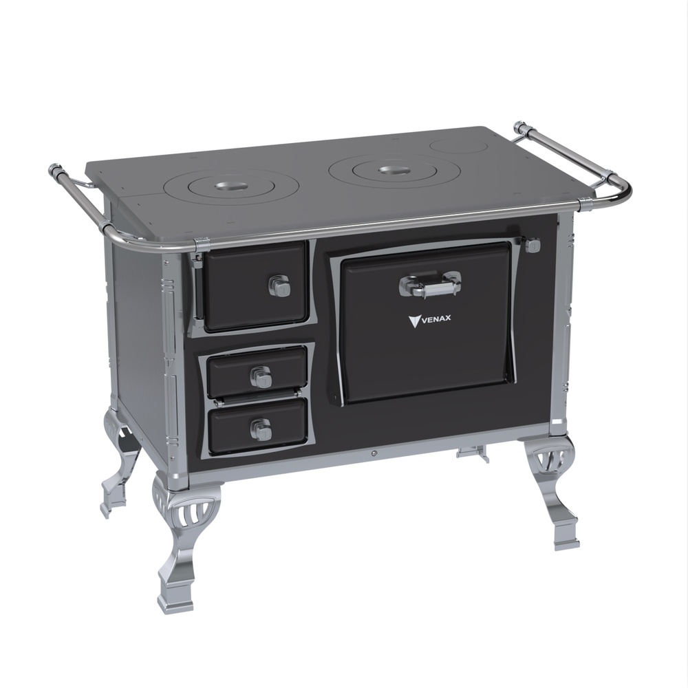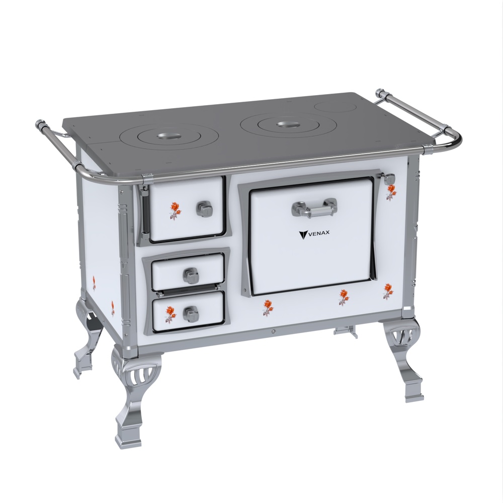 Fogão a Lenha GII N°1 Tradicional, com Chapa de Ferro Fundido Polida, Varão de Proteção Cromado, Corpo em Chapa QCV esmaltada, Cantoneiras e Suporte dos Varões em Inox, Guarnições das Portas e Pés em Alumínio Polido, Forno Esmaltado, Puxadores em Zamac.