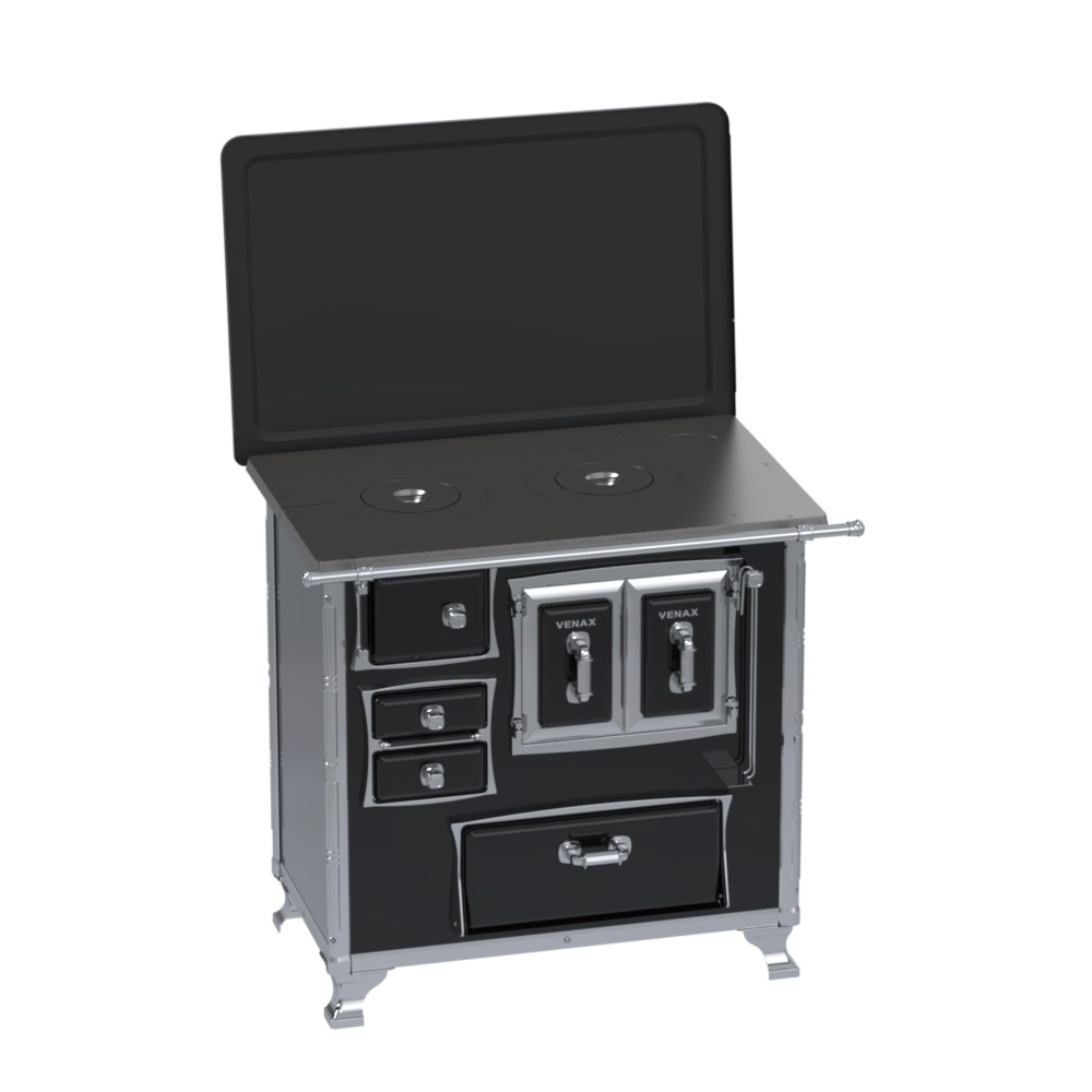 Fogão a Lenha Nº1 Gabinete Séc. XVIII, Chapa de Ferro Fundido Polida, Tampa com Pintura Epóxi, Varão de Proteção Cromado, Suportes de Varões em Zamac, Fornalhas de Tijolos, Grade do Fogo em Ferro Fundido, Porta Dupla no Forno, Cantoneiras em Inox, Com Estufa, Guarnições das Portas e Pés em Alumínio Polido, Corpo e Forno Esmaltado, Puxadores em Zamac.