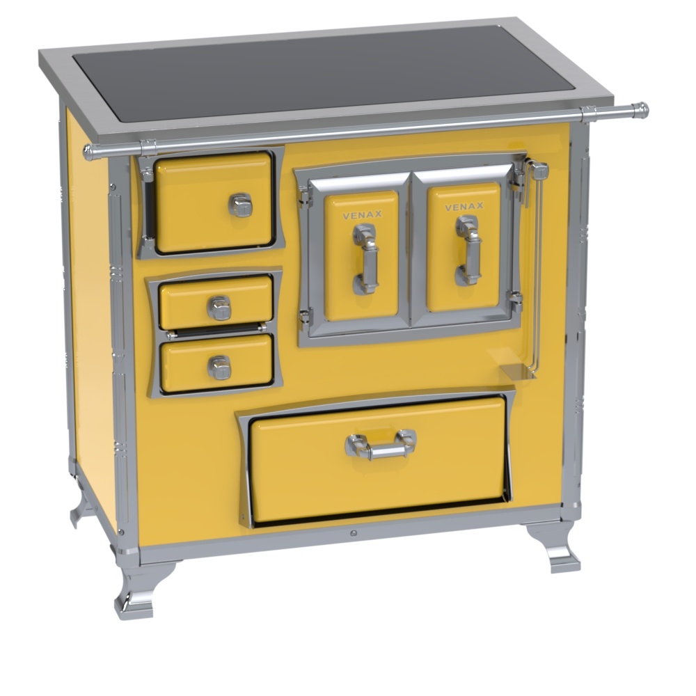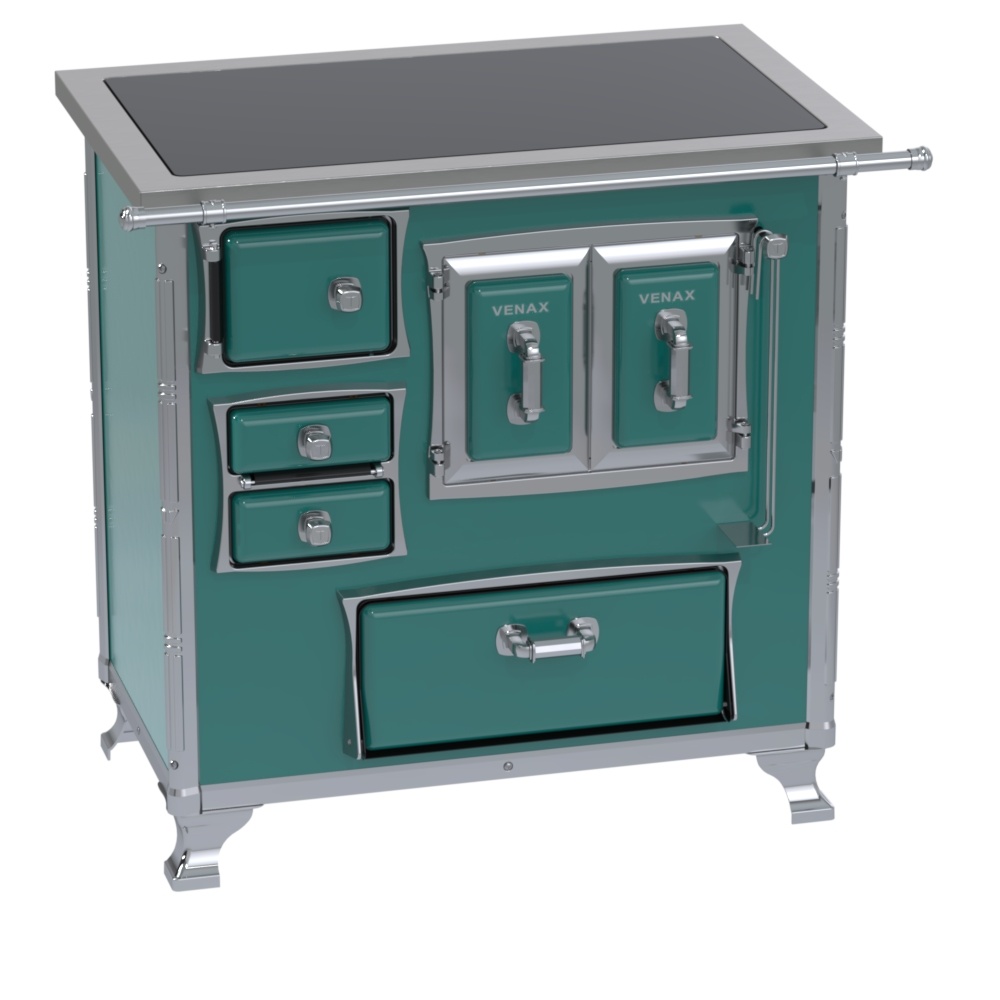 Fogão a Lenha N°1 Gabinete Séc.XVIII Premium, Chapa de Vitrocerâmica com Moldura em Inox, Varão de Proteção Frontal Cromado, Puxadores e Suportes de Varão em Zamac, Corpo em Chapa QCV esmaltada, Cantoneiras em Inox, Porta Dupla no Forno, Estufa, Guarnições das Portas e Pés em Alumínio Polido, Forno Esmaltado, Puxadores em Zamac.