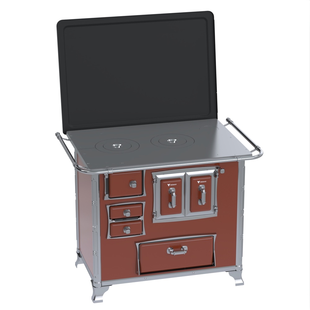 Fogão a Lenha Nº 2 Gabinete Séc. XVIII, Chapa de Ferro Fundido Polida, Tampa com Pintura Epóxi, Varão de Proteção Cromado, Suportes de Varões em Zamac, Fornalhas de Tijolos, Grande do Fogo em Ferro Fundido, Porta Dupla no Forno, Cantoneiras em Inox, Com Estufa, Guarnições das Portas e Pés em Alumínio Polido, Corpo e Forno Esmaltado, Puxadores em Zamac.