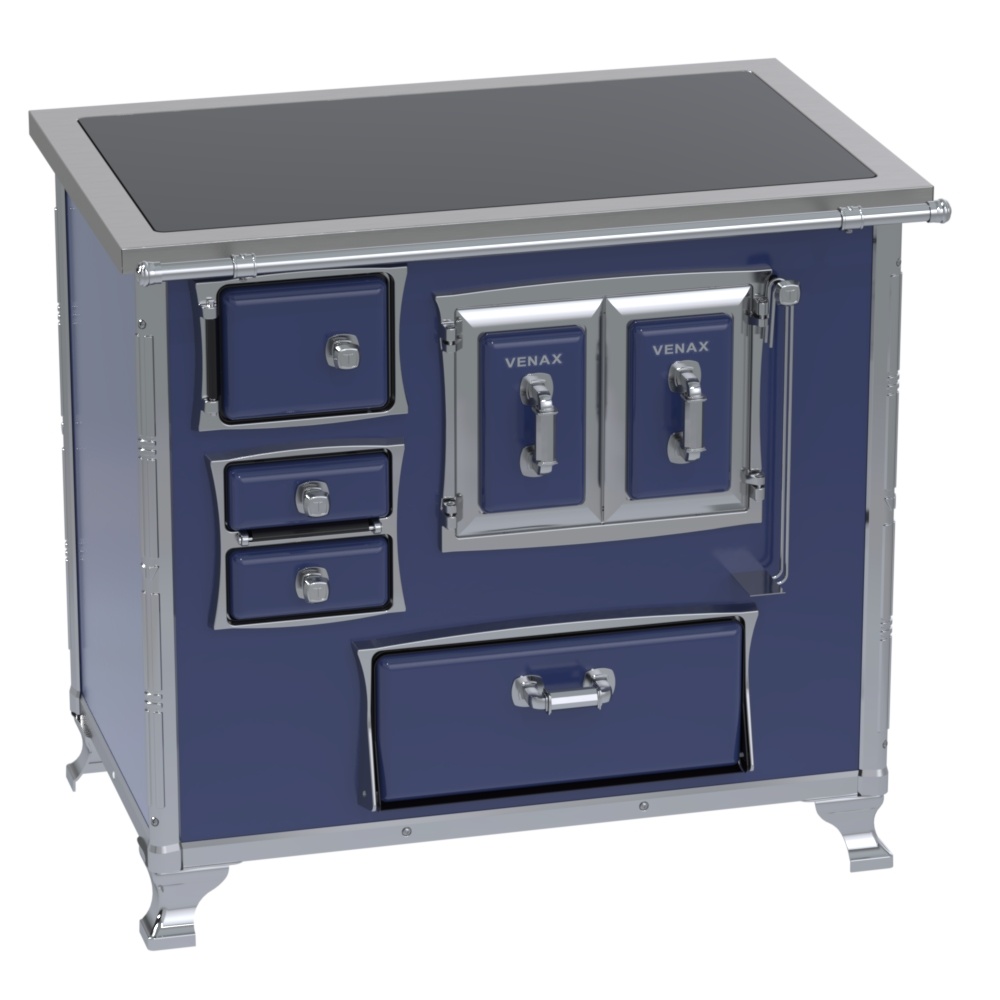 Fogão a Lenha N°2 Gabinete Séc.XVIII Premium, Chapa de Vitrocerâmica com Moldura em Inox, Varão de Proteção Frontal Cromado, Puxadores e Suportes de Varão em Zamac, Corpo em Chapa QCV esmaltada, Cantoneiras em Inox, Porta Dupla no Forno, Estufa, Guarnições das Portas e Pés em Alumínio Polido, Forno Esmaltado, Puxadores em Zamac.