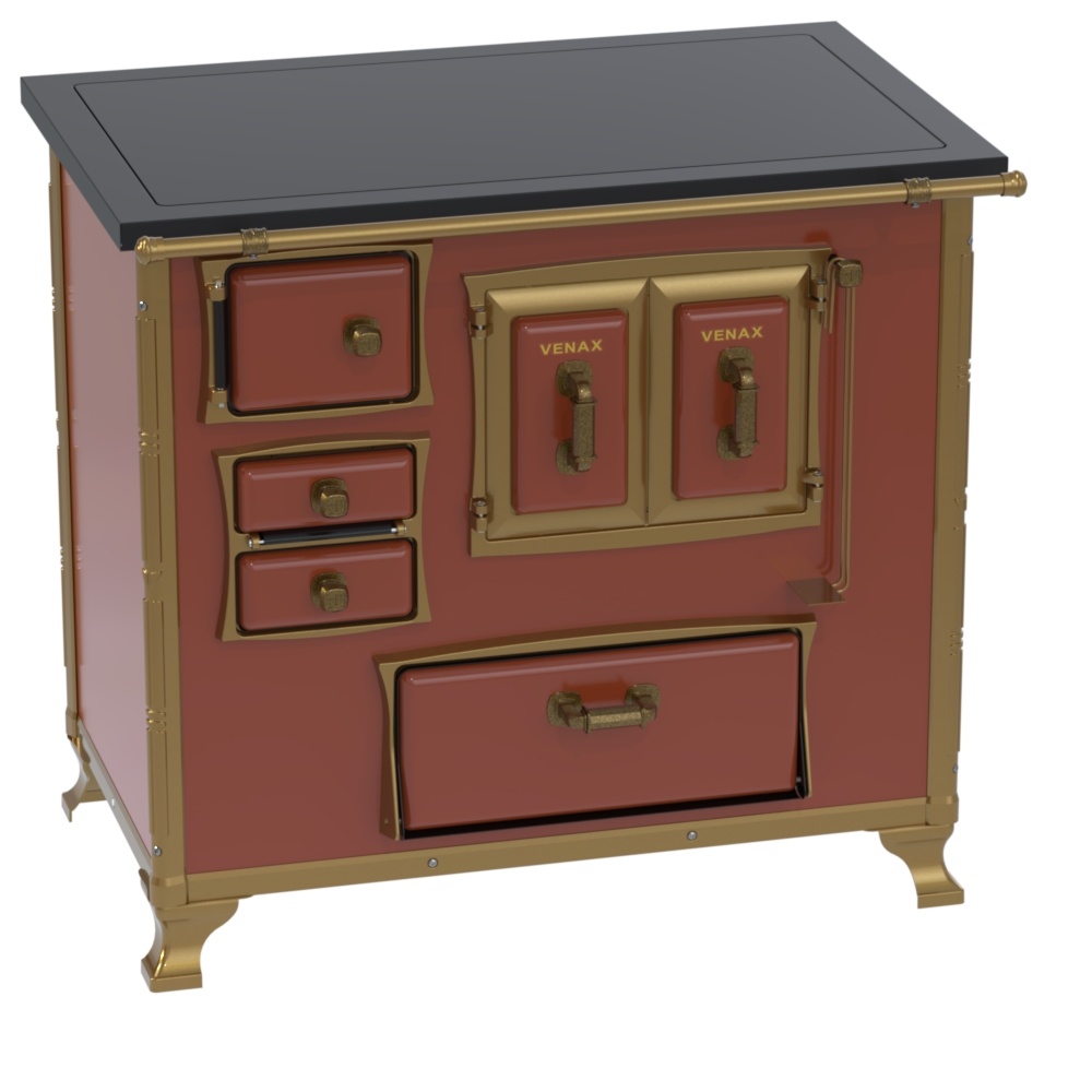 Fogão a Lenha Nº 2 Renaissance Premium, Chapa de Vitrocerâmica com Moldura em Preto, Fornalhas de Tijolos, Grade do Fogo em Ferro Fundido, Porta Dupla no Forno, Com Estufa, Guarnições das Portas e Pés em Alumínio Banhados em Ouro Velho, Corpo e Forno Esmaltado. Puxadores, Cantoneiras, Suportes e Varâo de Proteção Frontal com Acabamento em Ouro Velho.