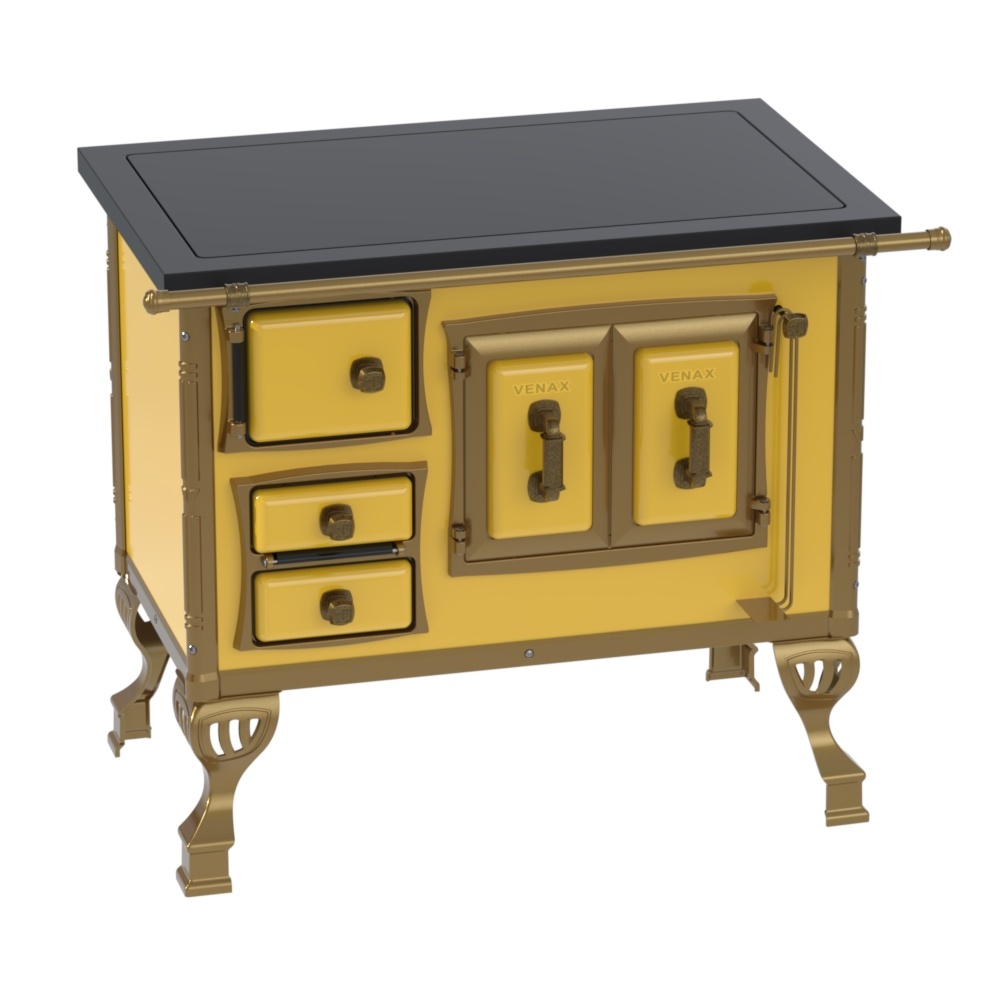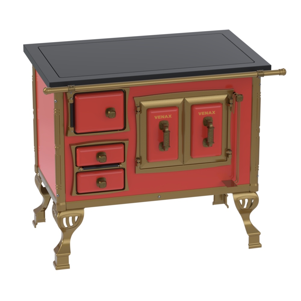Fogão a Lenha Nº1 Colonial Premium: Chapa de Vitrocerâmica com Moldura em Preto, Fornalhas de Tijolos, Grade do Fogo em Ferro Fundido, Porta Dupla no Forno, Guarnições das Portas e Pés em Alumínio Banhados em Ouro Velho, Corpo e Forno em Chapa QCV Esmaltada. Puxadores, Cantoneiras, Suportes e Varão de Proteção Frontal com Acabamento em Ouro Velho.
