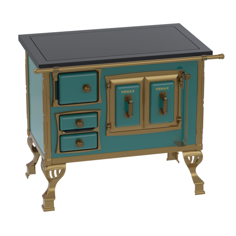 Fogão a Lenha Nº1 Colonial Premium: Chapa de Vitrocerâmica com Moldura em Preto, Fornalhas de Tijolos, Grade do Fogo em Ferro Fundido, Porta Dupla no Forno, Guarnições das Portas e Pés em Alumínio Banhados em Ouro Velho, Corpo e Forno em Chapa QCV Esmaltada. Puxadores, Cantoneiras, Suportes e Varão de Proteção Frontal com Acabamento em Ouro Velho.