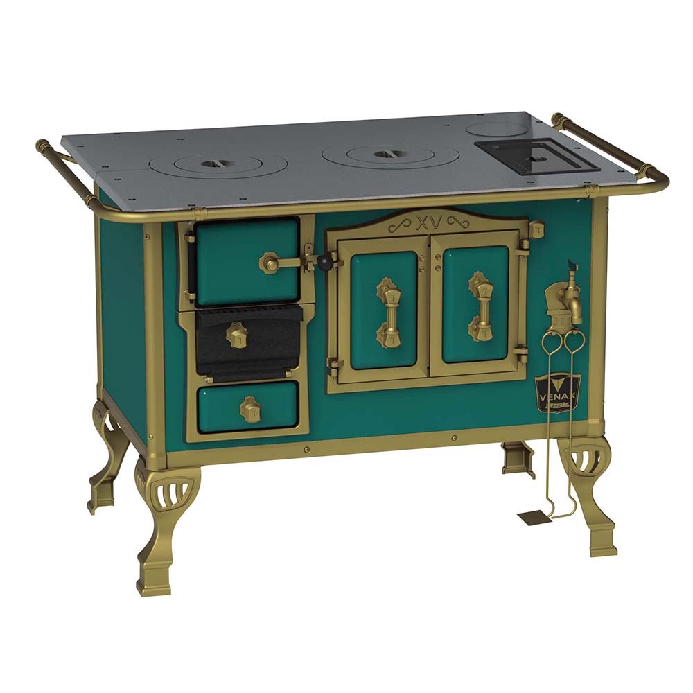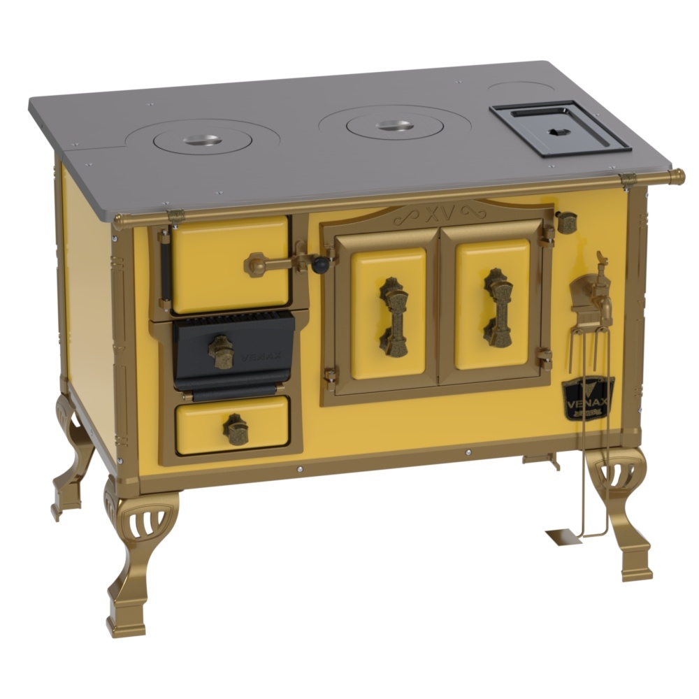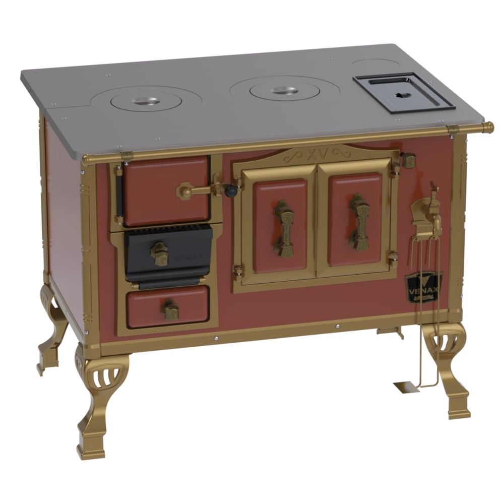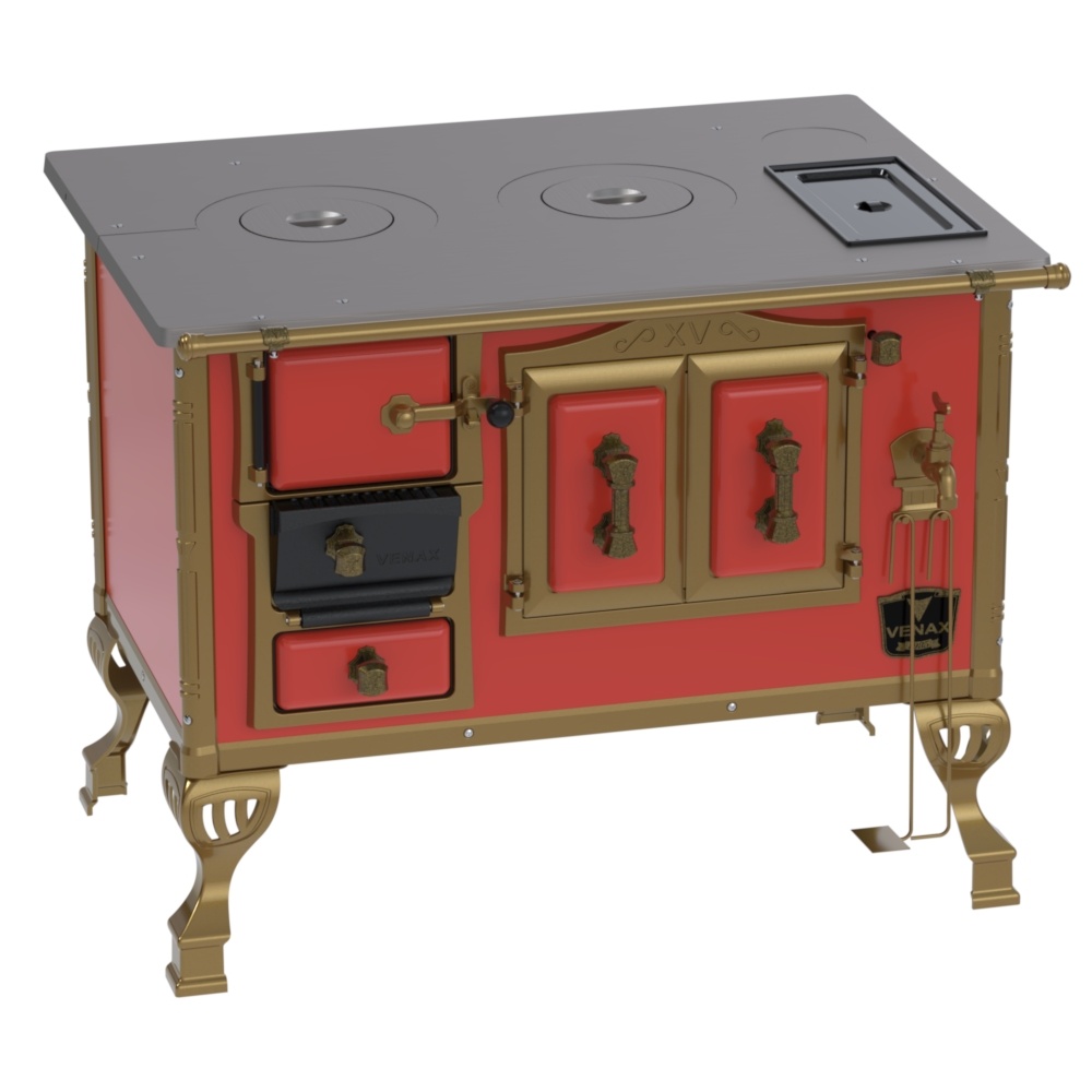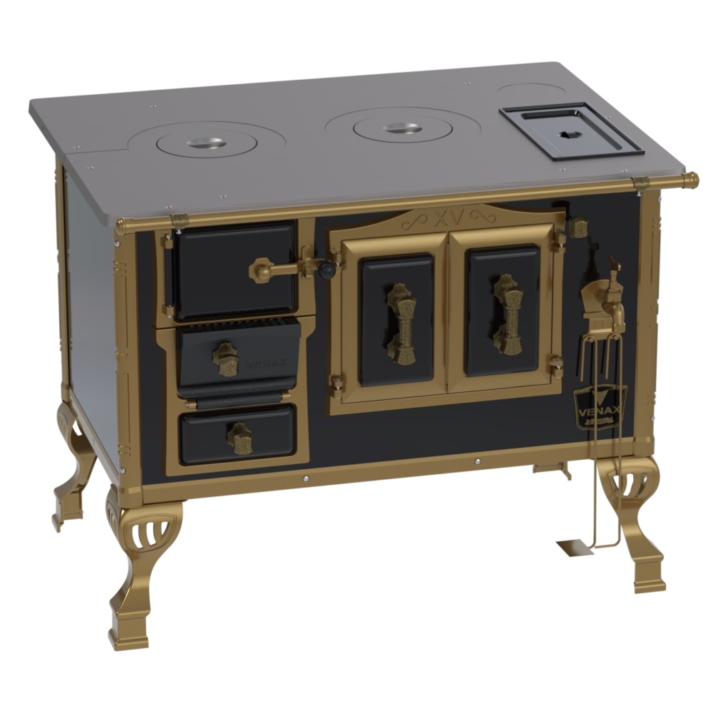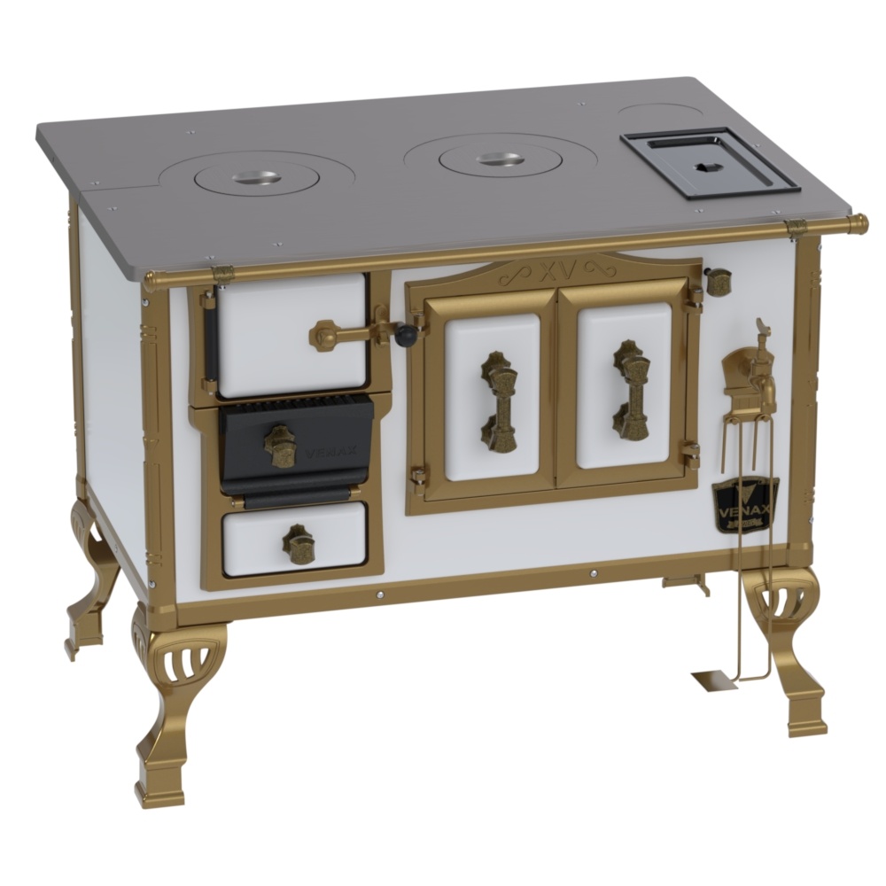 Fogão a Lenha Nº2 Duque, com Chapa de Ferro Fundido Polida, Caldeira de Alumínio Teflonada, Corpo em Chapa QCV Esmaltada, Tranca na Porta da Fornalha, Porta Dupla no Forno, Porta de Ar em Ferro Fundido, Cantoneiras Reforçadas com Design do Século XV, Suporte dos Varões Reforçados, Puxadores e Guarnições das Portas em Estilo do Século XV, com Acabamento em Ouro Velho.
