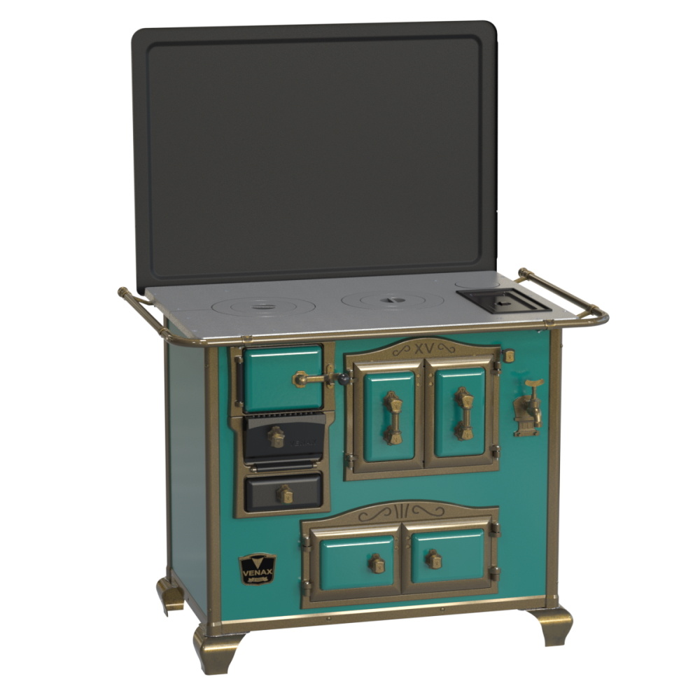 Fogão a Lenha Nº2 Imperador, com Chapa de Ferro Fundido Polida, Caldeira de Alumínio Teflonada, Corpo em Chapa QCV Esmaltada, Tranca na Porta da Fornalha, Porta Dupla no Forno e Estufa, Porta de Ar em Ferro Fundido, Cantoneiras Reforçadas com Design do Século XV, Suporte dos Varões Reforçados, Puxadores e Guarnições das Portas em Estilo do Século XV, com acabamento em Ouro Velho.
