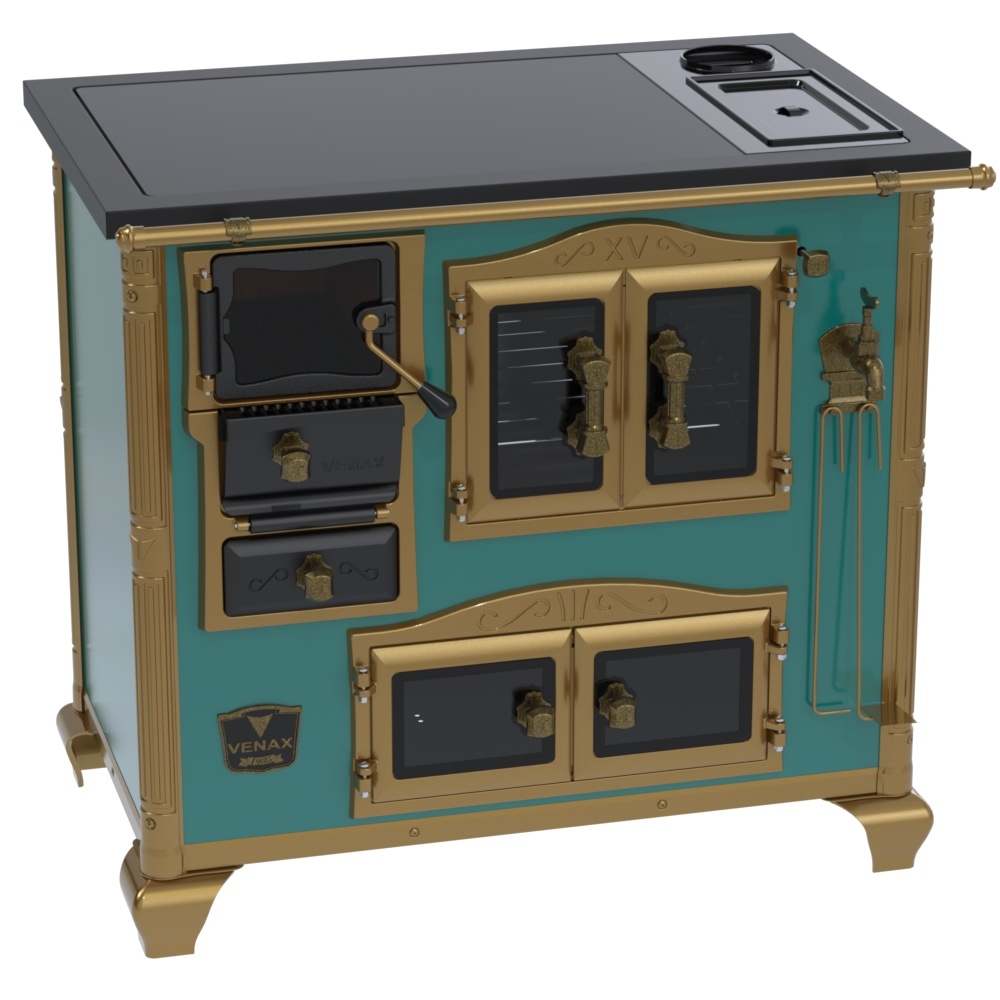 Fogão a Lenha Nº2 Imperador Vitreo Premium, Chapa Vitrocerâmica com Moldura em Aço na Cor Preta, com Saída para Chaminé na Chapa, Caldeira em Alumínio Teflonada, Corpo em Chapa QCV Esmaltada, Tranca na Porta da Fornalha, Porta Dupla no Forno e na Estufa. Portas da Fornalha, Forno e Estufa de Vidro. Puxadores, Guarnições, Cantoneiras e Suportes dos Varões Estilo Século XV, com Acabamento em Tom Ouro Velho.