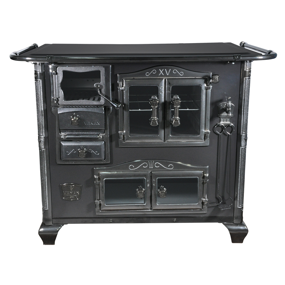 Fogão a Lenha Nº2 Princess, Chapa de Ferro Fundido Polida, Caldeira de Alumínio Teflonada, Corpo em Chapa QCV Esmaltada, Tranca na Porta da Fornalha, Porta Dupla no Forno e na Estufa. Portas da Fornalha, Forno e Estufa de Vidro. Puxadores, Guarnições, Cantoneiras e Suportes dos Varões Estilo Século XV, com Acabamento Especial.