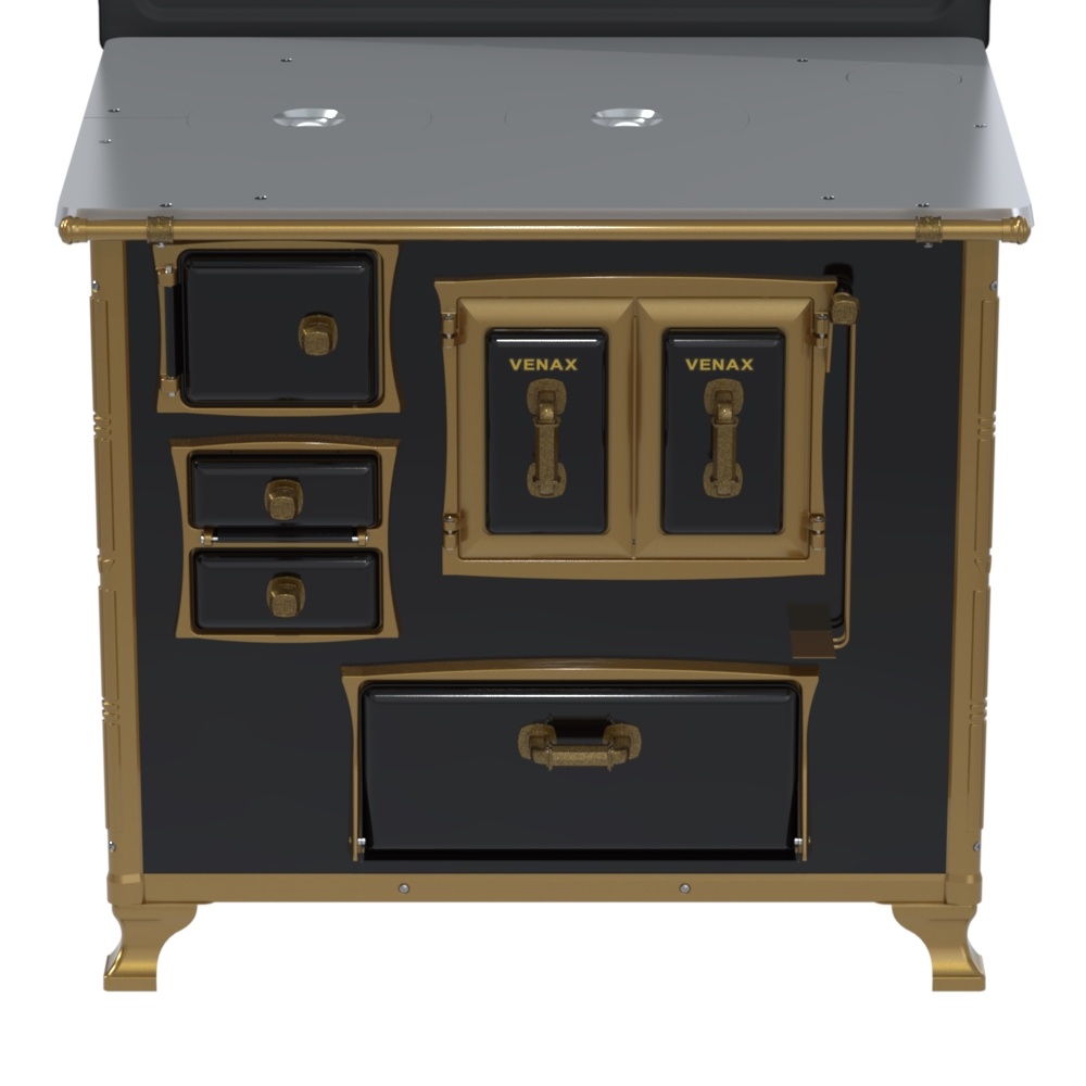 Fogão a Lenha Nº2 Renaissance, Chapa de Alumínio Polida, Tampa com Pintura Epóxi, Fornalhas de Tijolos, Grade do Fogo em Ferro Fundido, Porta Dupla no Forno, Com Estufa, Guarnições das Portas e Pés em Alumínio Banhados em Ouro Velho, Corpo e Forno Esmaltado. Puxadores, Cantoneiras, Suportes e Varões de Proteção com Acabamento em Ouro Velho.